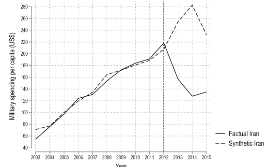Trends in military spending per capita, (US$): Iran versus Synthetic Iran.