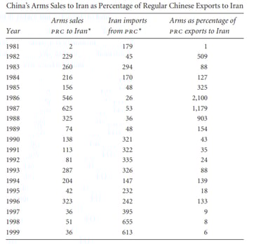 The percentage of arms as exports to specific countries can also be examined more closely to get a clear sense of their important trade value. In fact, throughout the Iran-Iraq War, China maintained an official position of neutrality and for years denied supplying either side with weapons. Despite these denials, scholars have pieced together enough evidence to link the Chinese to several of these transfers. In the case of Iran, China’s arms sales as a percentage of total exports ranged from 9 to 21% between 1986 and 1988, before dipping after the Iran-Iraq war in the early 1990s, yet still averaging 50% of total Iranian civilian imports in the 10 years after the war.